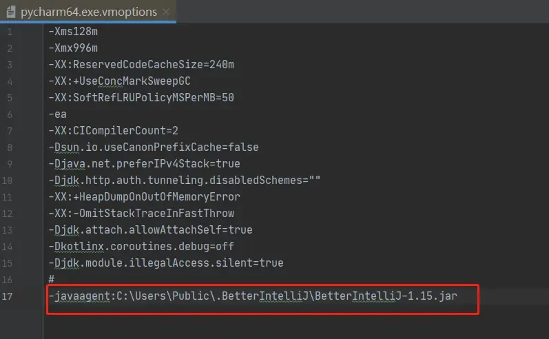 -javaagent:C:UsersPublic.BetterIntelliJBetterIntelliJ-版本号.jar