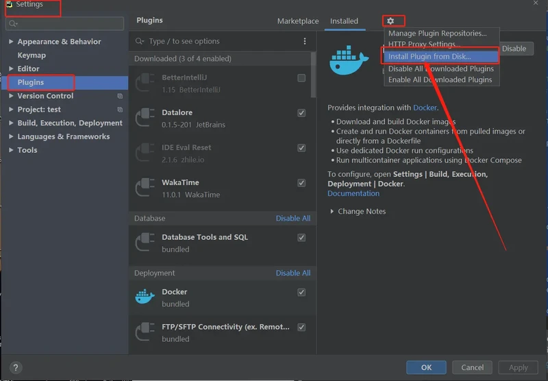 2.进入应用后,进入插件中心 :File -> Settings -> Install Plugin From Disk,通过磁盘安装插件,如下图所示