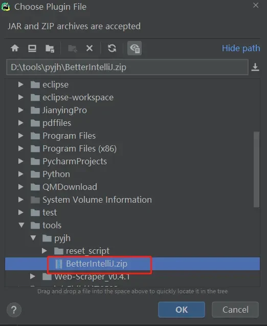 选择BetterIntelliJ.zip插件位置,点击ok。