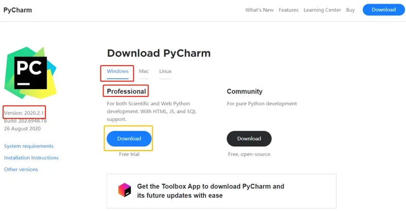 找到最新版本的pycharm,可以看到已经更新到2020.2.1版本了。这里就以windows专业版为例。点击下载。