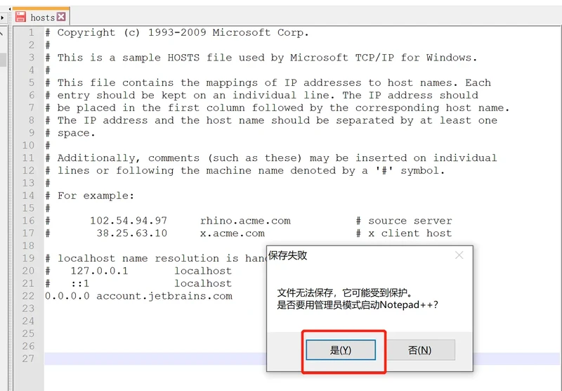 1.4、保存hosts文件,因为hosts文件属于受系统保护文件,需要获取管理员权限才能保存编辑,nodepad++在保存时会自动提示是否使用管理员模式启动nodepad++,点击【是】,nodepad++会自动重启,再次保存即可