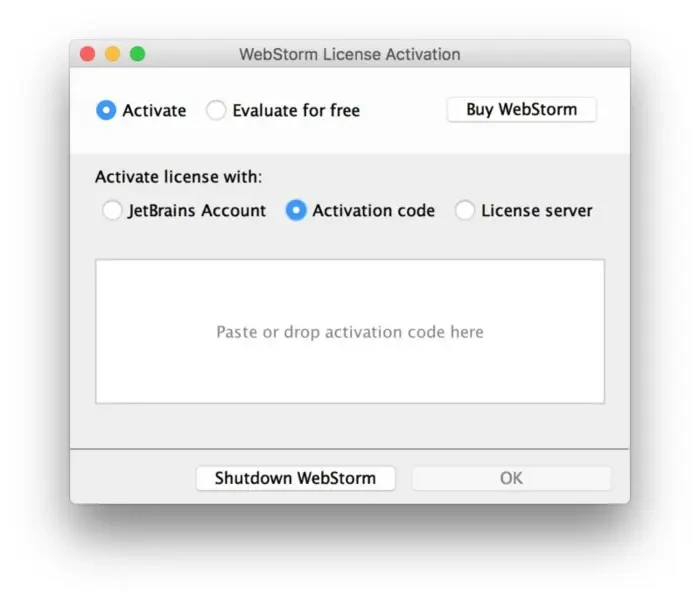 打开webstorm进入激活页面按图示选择验证方式,把刚刚复制的内容, 粘贴到 activation code里面就OK了!!!