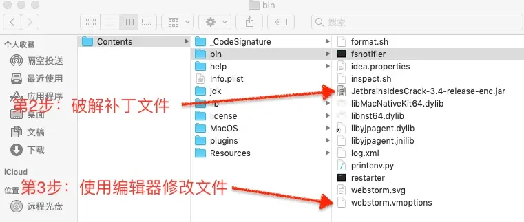 1.打开finder的应用程序,找到webstorm,右键显示包内容 2. Content -> bin把破解程序复制进去 (参考下图)