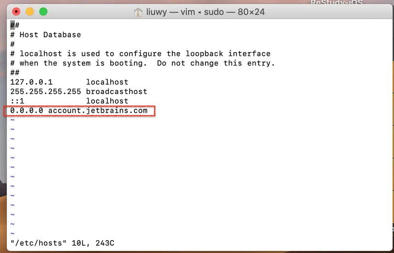 进入文件编辑页面, 按i键, 进入插入模式, 在最后一行添加 0.0.0.0 account.jetbrains.com, 按esc键, 按下 shift+: 键, 输入wq 保存返回。
