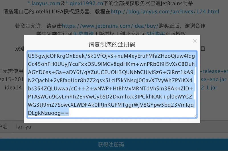 打开网址(IntelliJ IDEA 注册码),我们能看到下面的界面,直接点击获取激活码,将生成的激活码粘贴到WebStorm激活对话框中的Lisence Code输入框,点击OK即可破解。参考下方图示: