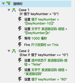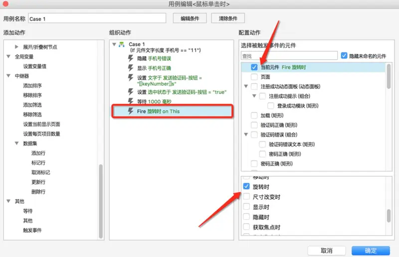 上面这两个判断就能做到被触发时,数字进行倒计时,然后还需要一个触发【旋转时】的动作。给【发送验证码】按钮添加一个【点击】的交互用例,设置触发事件,找到【当前元素】设置交互用例。
