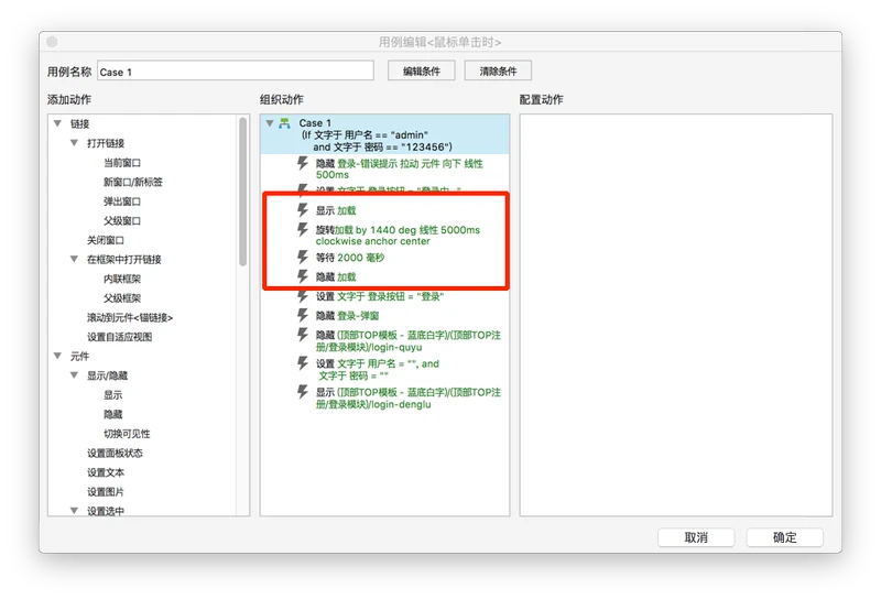 然后在【发送验证码】按钮上添加一个不会使用的交互用例,比如:我这里使用的是【旋转时】。