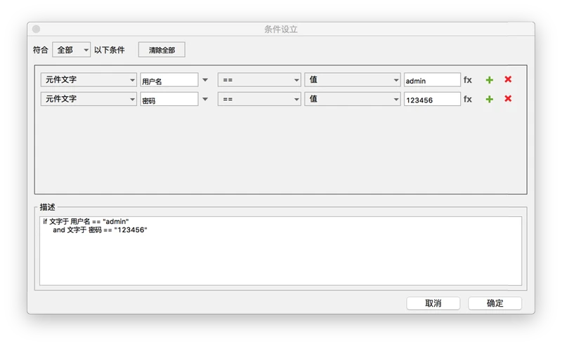 判断部分只需要设置【元件文字】等于【具体值】就可以。