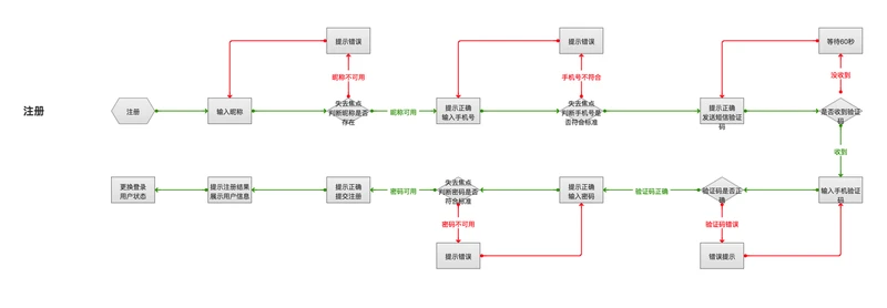 昵称需要判断是否为空;手机号需要判断手机号位数、是否符合手机号标准;发送验证码需要确认手机号字段符合要求;重复发送验证码有60s的重置时间;已发送的验证码具有5分钟的生效时间;已使用的验证码立即销毁;重新输入的密码需要判断不为空,需要符合安全标准;第二次输入的密码需要判断是否和第一编的密码相同。