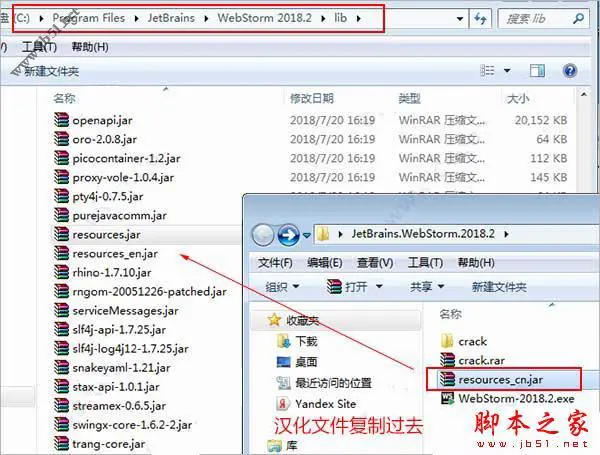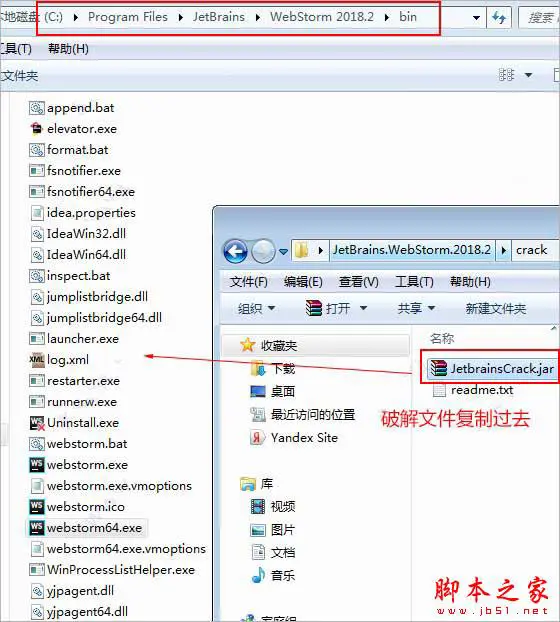 5、这时将破解文件Crack.rar解压出来,再将“JetbrainsCrack.jar”复制到软件安装目录【C:Program FilesJetBrainsWebStorm 2018.2bin】;