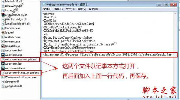 6、再用记事本打开“webstorm.exe.vmoptions”和“webstorm64.exee.vmoptions”这两个文件,再后面添加破解文件的路径,就是中括号中的内容【-javaagent:C:Program FilesJetBrainsWebStorm 2018.2binJetbrainsCrack.jar】